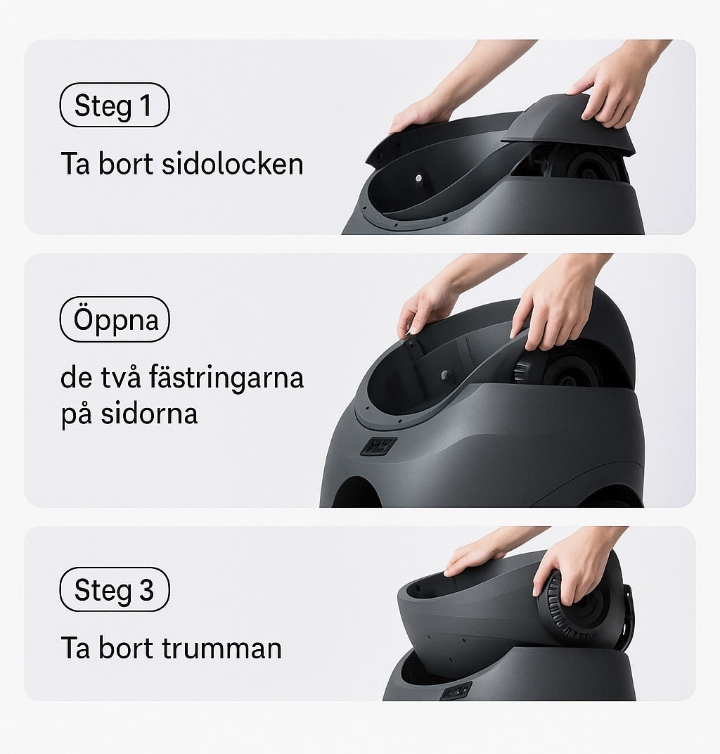 Alla våra kattlådor är utrustade med viktsensorer eller infraröda sensorer som känner när katten kommer in, och trumman stannar omedelbart. Vår nya modell har dessutom förbättrad klämsäkerhetssensor och säkerhetsöppning. Om katten skulle gå in mitt i ett rengöringscykel, avbryts processen direkt för att garantera säkerheten.