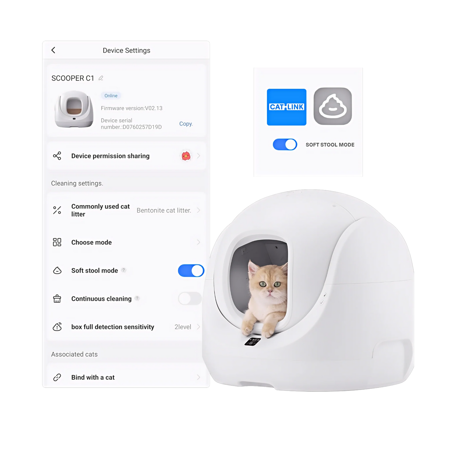 轻松适应猫咪的习惯——自动化日常活动,立即处理混乱情况,或针对软便情况安排清洁,无需动一根手指即可确保粪便新鲜。